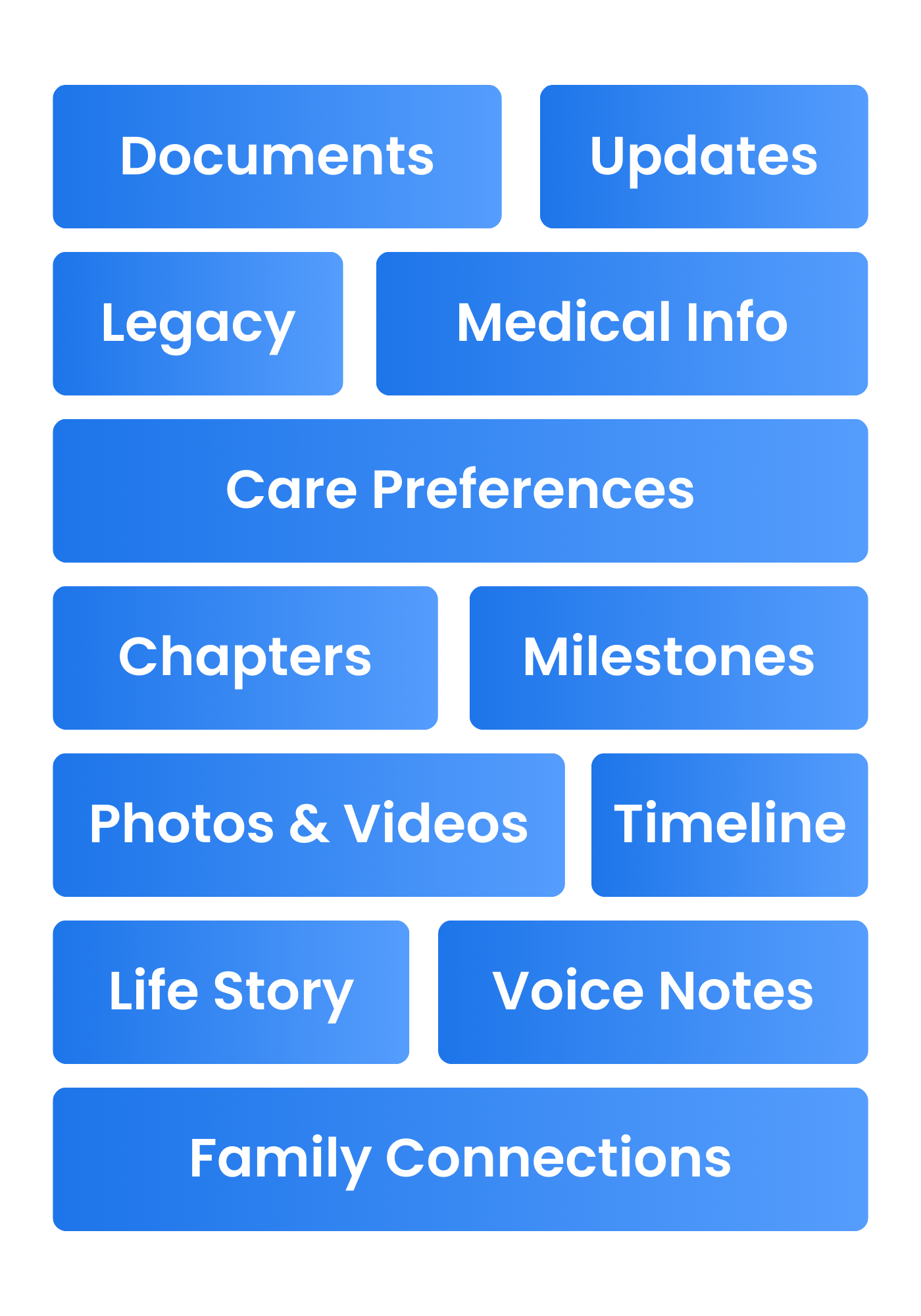 Add memories, photos, videos, milestones, voice notes, journals, and life chapters.
